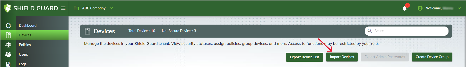 For Shield Guard to monitor a device, you must first import it into a tenant. To import one or more devices into the tenant, click on the Import Devices button.