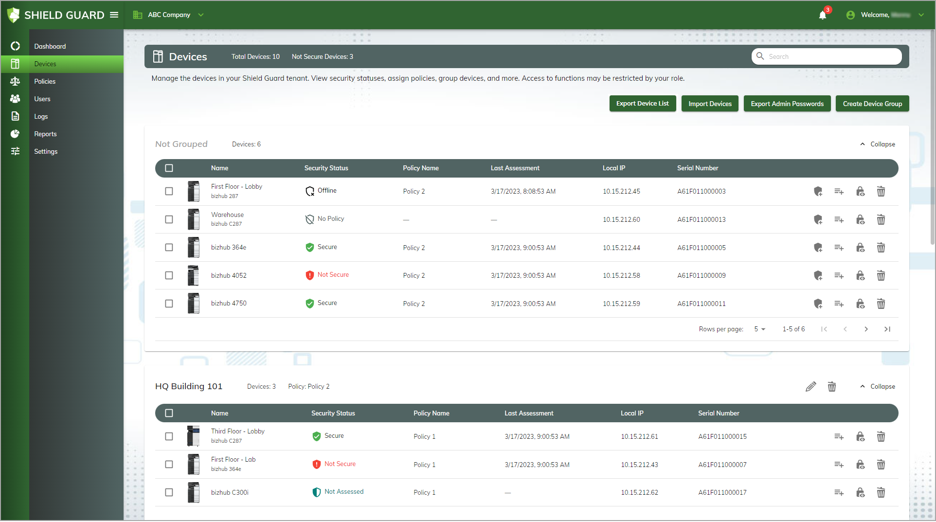 Three of the devices appear in the HQ Building 101 device group table.