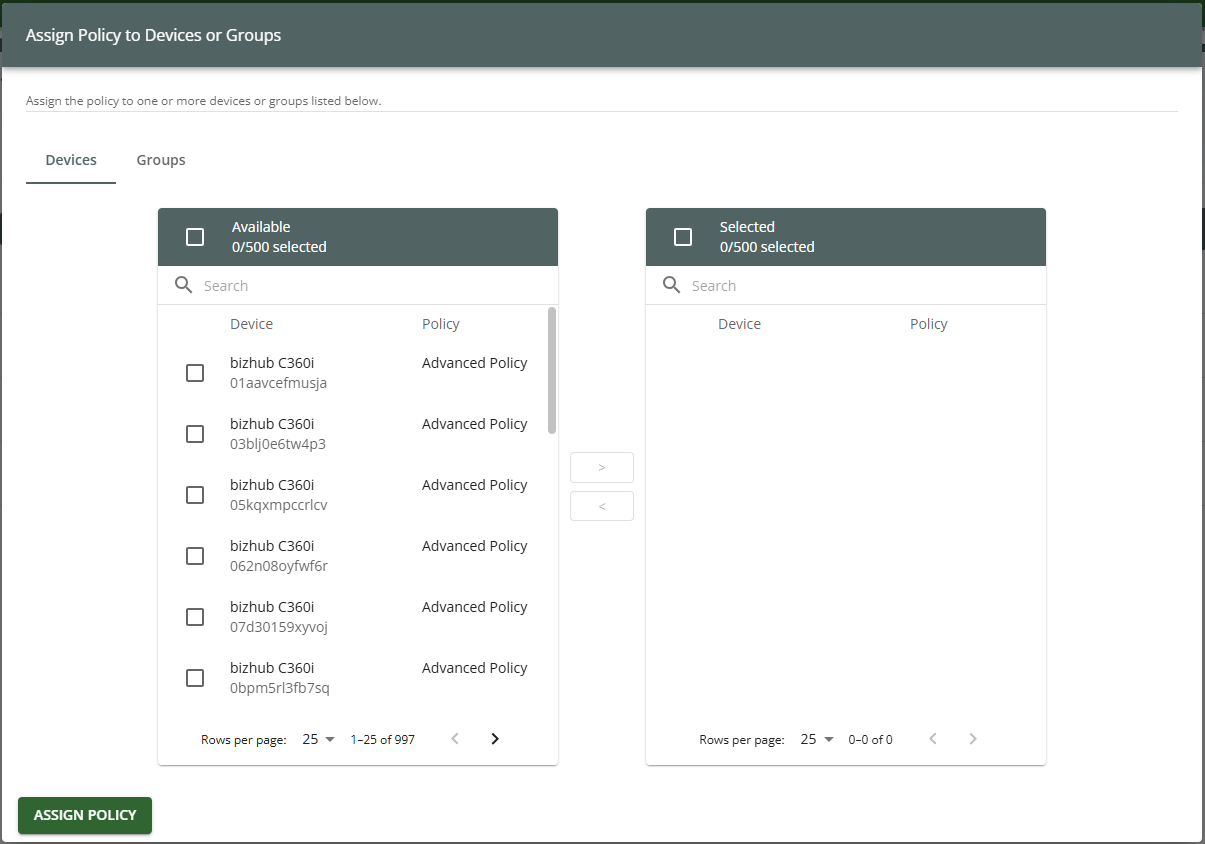 Note: To exit the Assign Policy to Devices or Groups window without selecting any devices, click outside the window at any time.