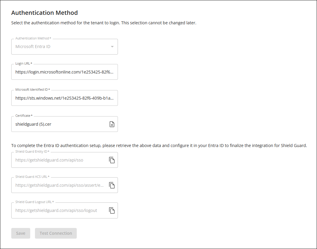These values are provided by the Microsoft Entra ID Enterprise Application that is configured to authenticate the Microsoft Entra ID tenant with the Shield Guard tenant.